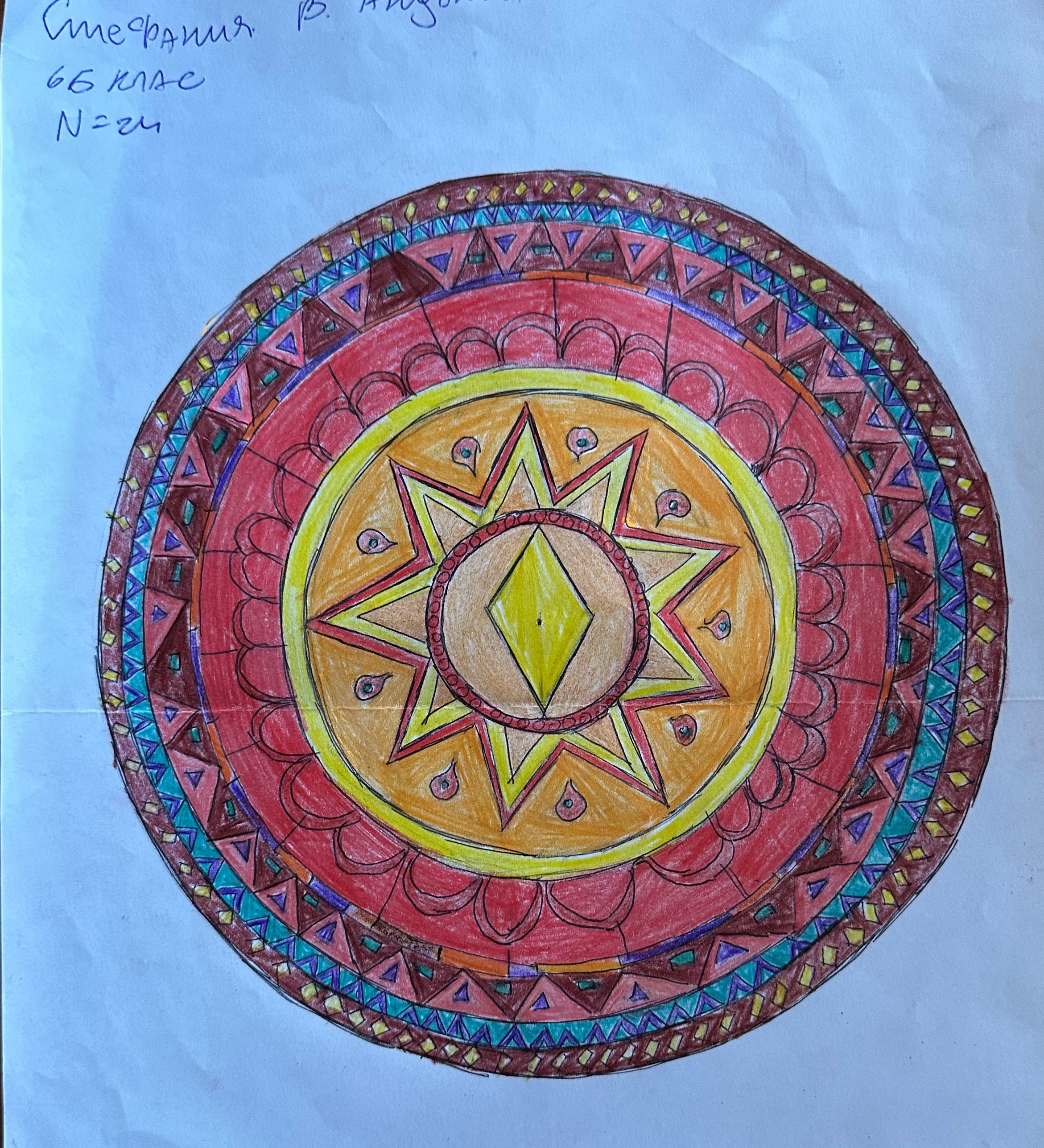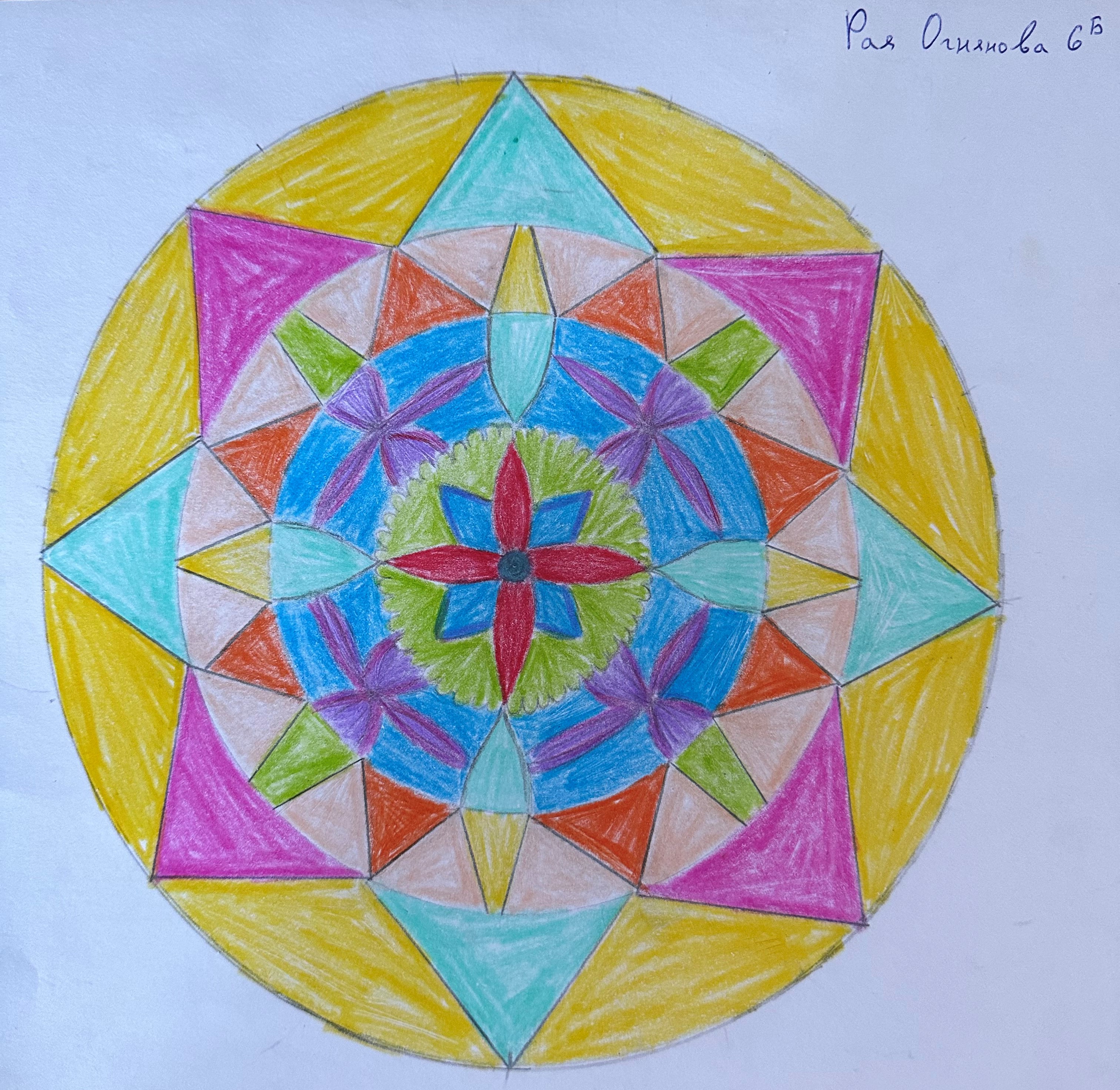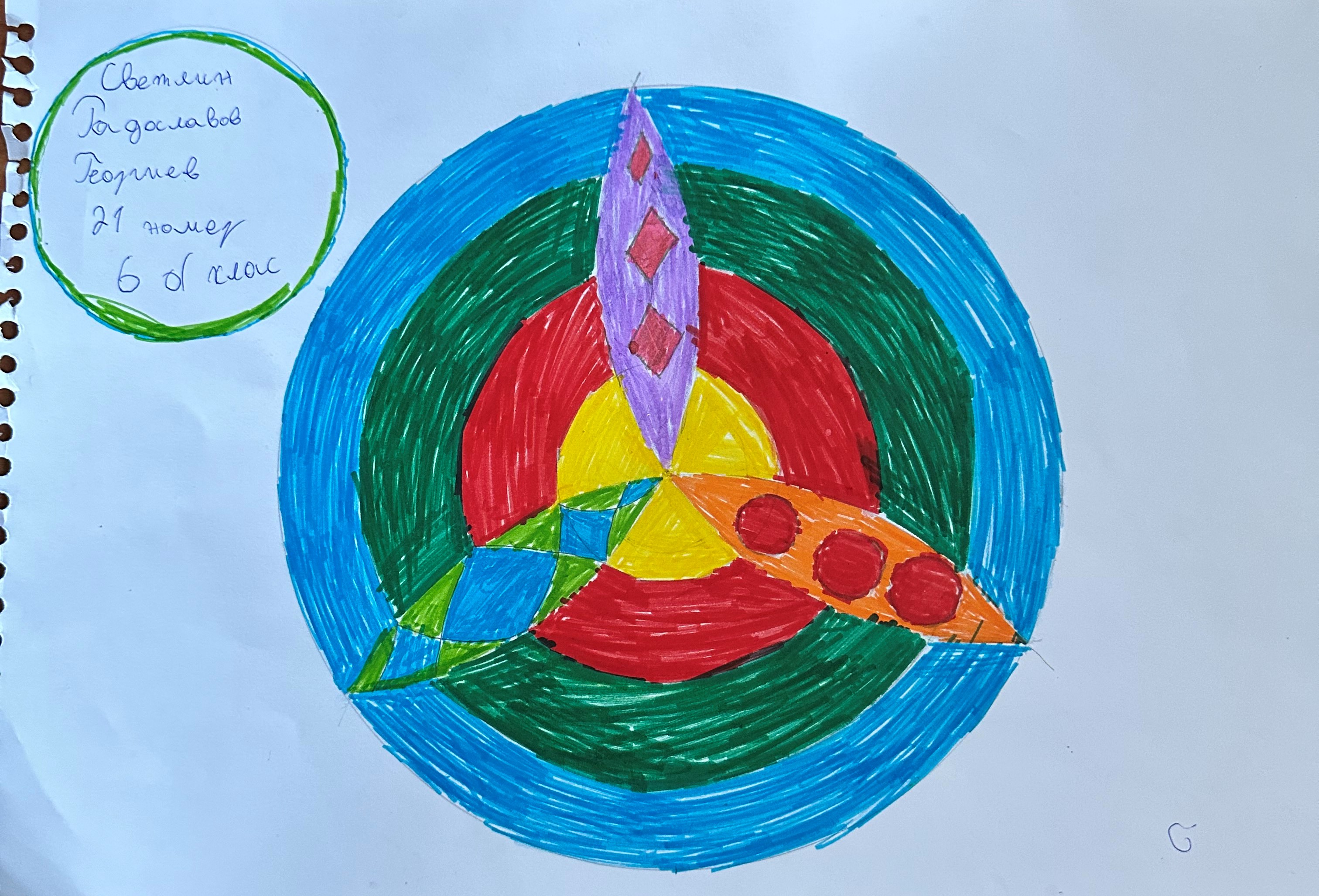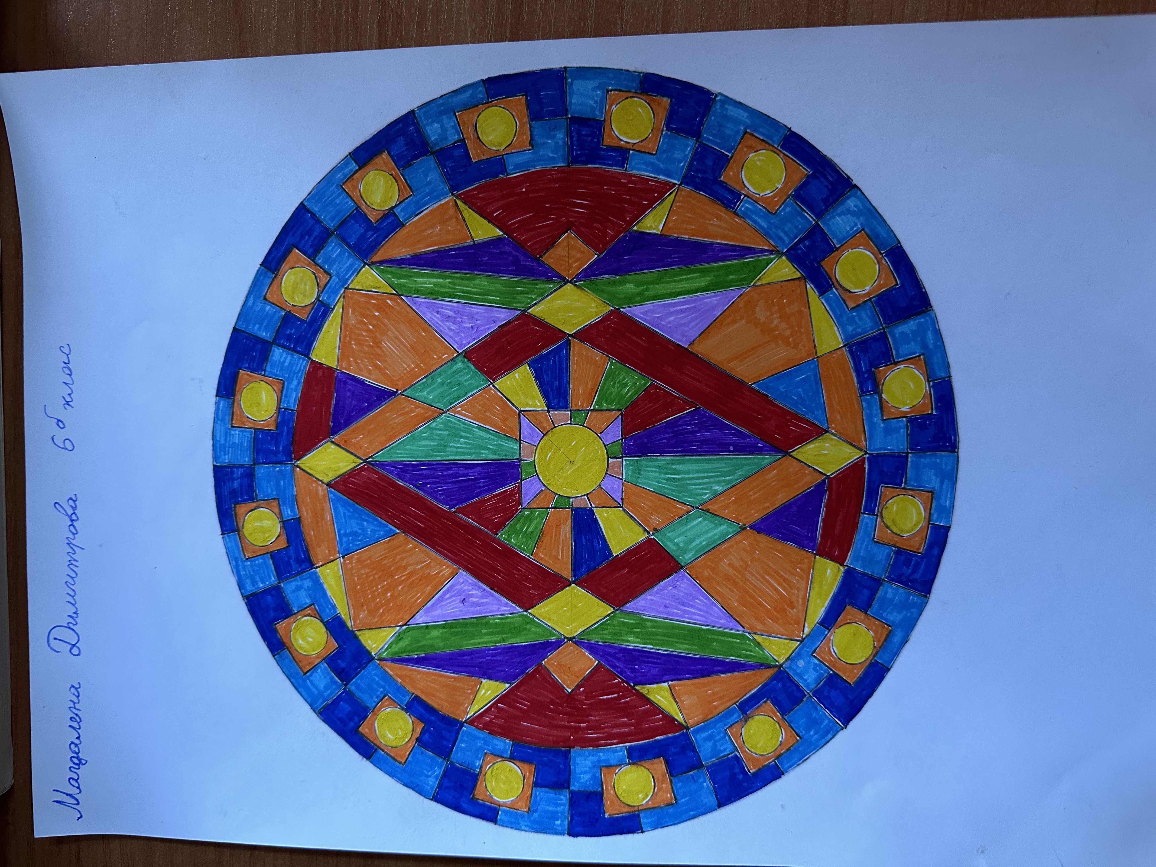 Учениците от 6 б клас в час по математика ИУЧ, приложиха на практика наученото по математика за чертане на правилен многоъгълник, сектор, централен ъгъл и направиха затворена композиция в кръг, използвайки и наученото в часовете по изобразително изкуство тази година за комбиниране на цветовете.