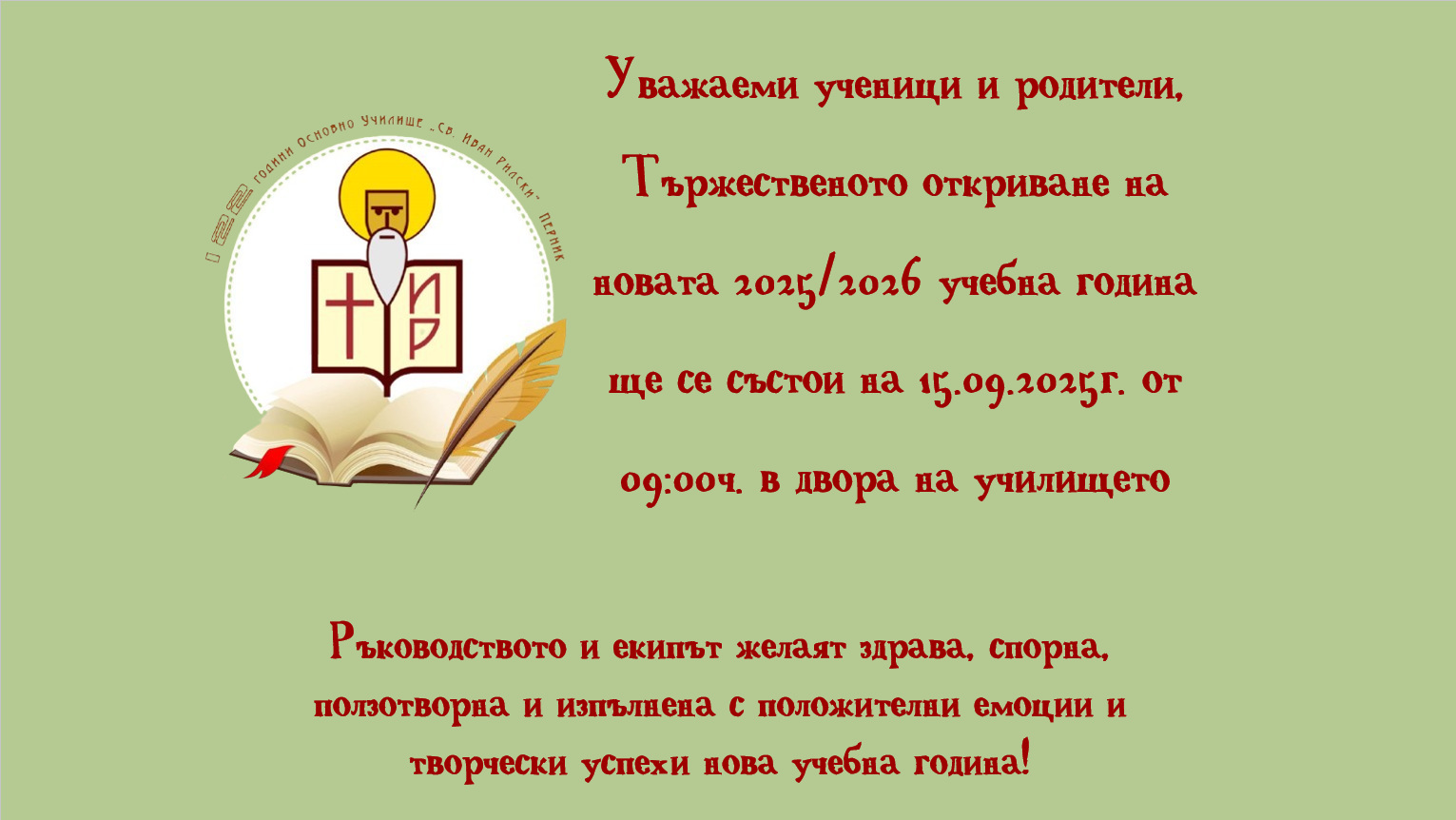 Уважаеми ученици и родители, тържественото откриване на новата учебна година ще се състои на 15.09.2025г. от 09:00 ч. в двора на училището.