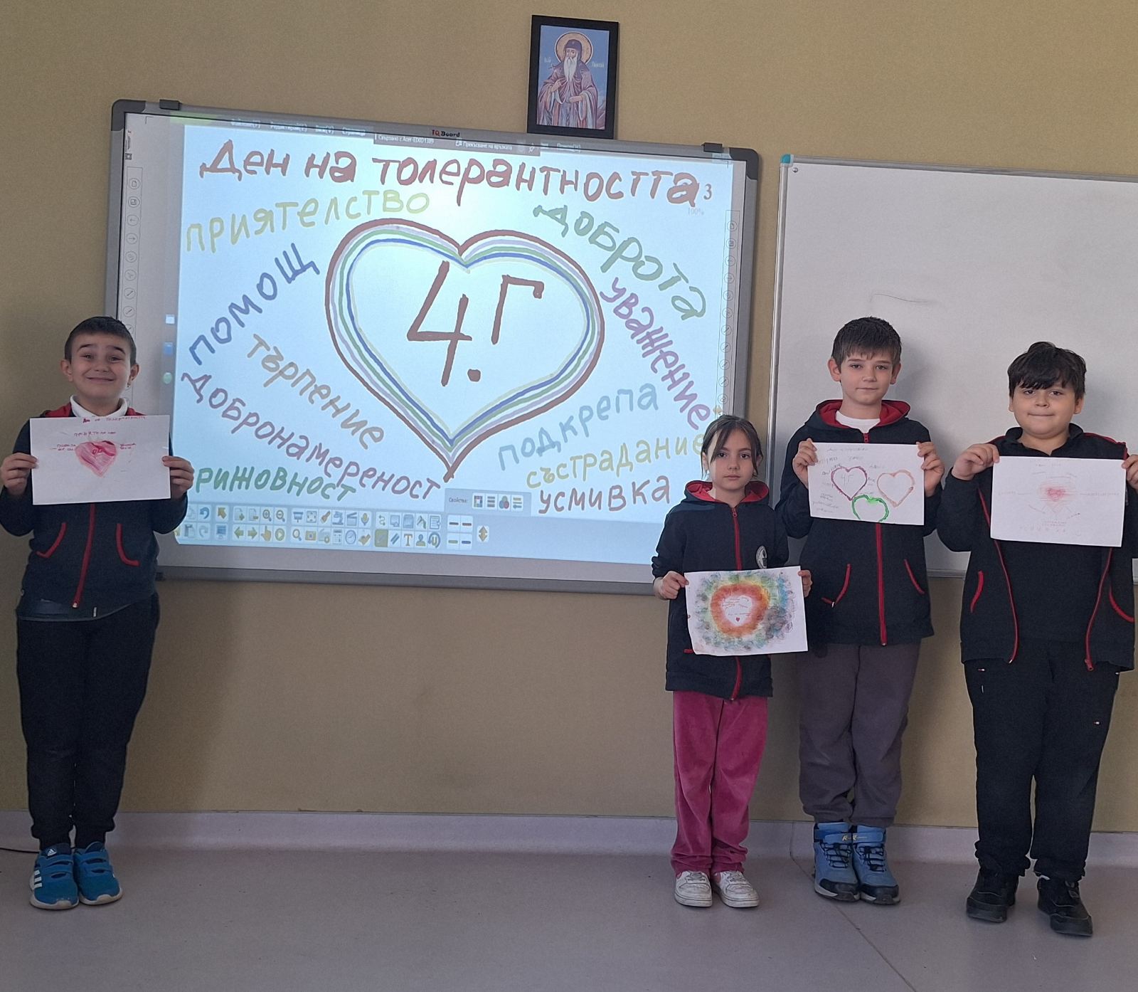 Тази учебна година, по инициатива на ученическия съвет, Денят на толерантността прерасна в Седмица на толерантността. Седмица, в която учениците от Ученическия съвет посетиха учениците от първи, втори и трети клас. Чрез приказки, игри и споделяне помогнаха на своите по-малки съученици да разберат какво е толерантност, колко е важно да приемаме различията и да се поставяме на мястото на другия.