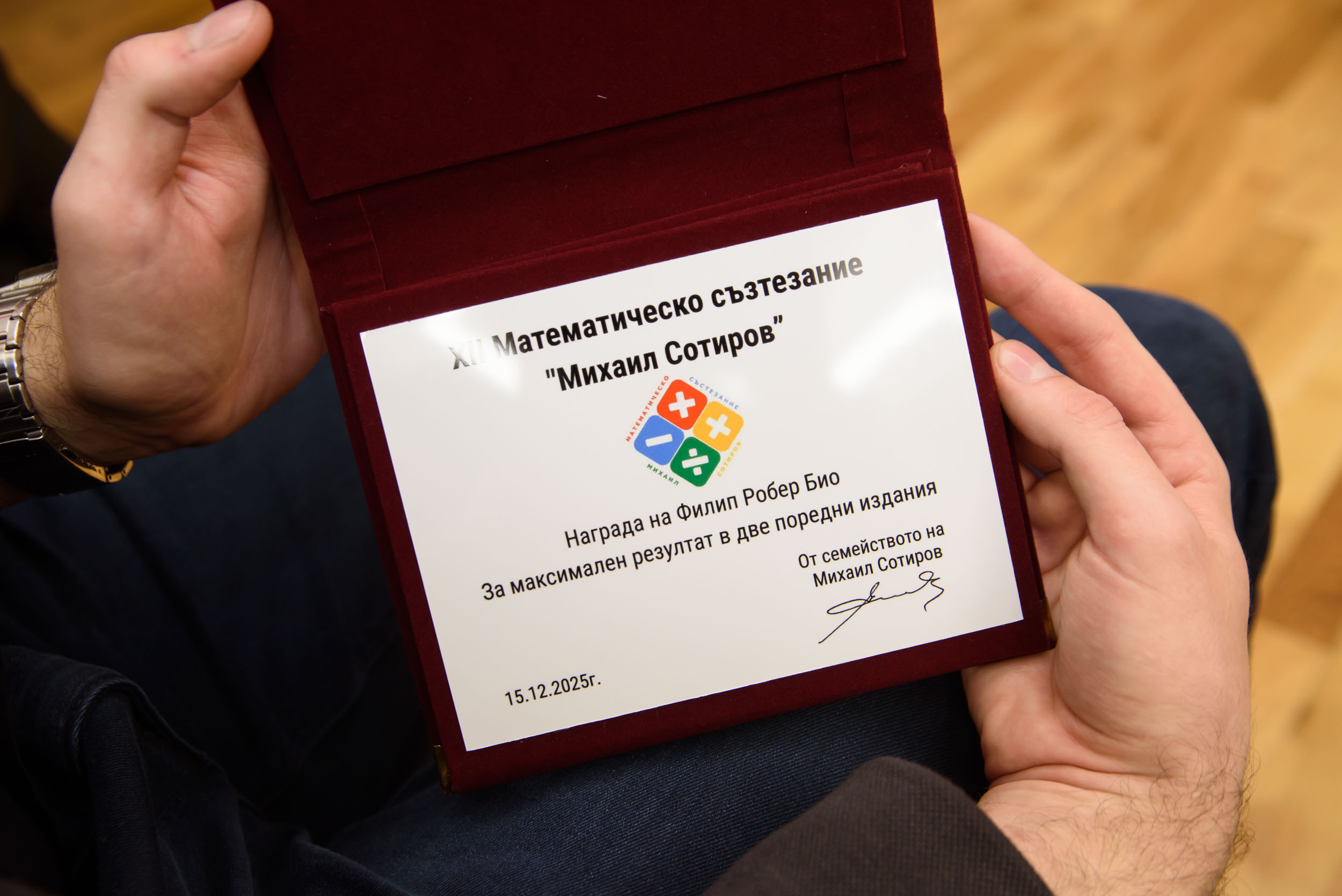 Церемонията завърши с усещане за гордост и удовлетворение – не само за наградените, но и за всички, които споделят пътя на знанието. XII математическо състезание „Михаил Сотиров“ отново показа, че любознателността и упоритостта се отблагодаряват, вдъхновявайки следващото поколение да изследва света на математиката с увереност и страст.