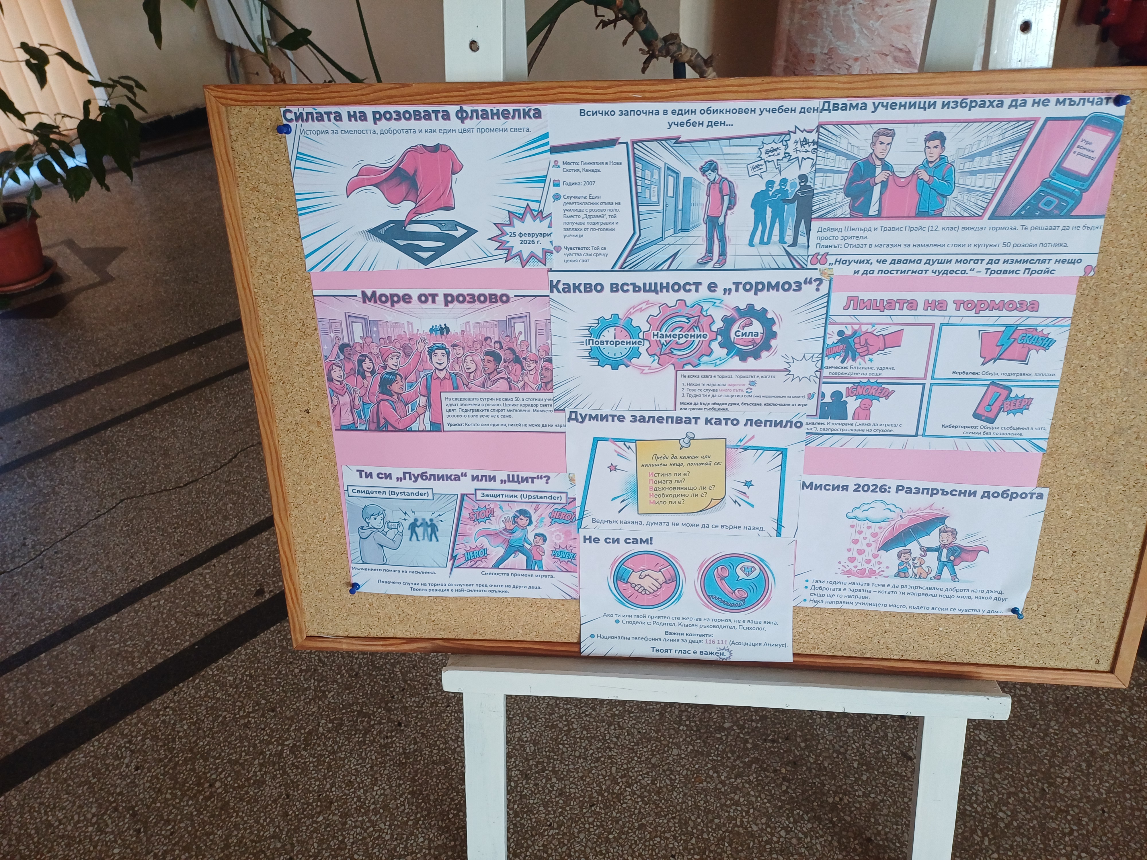 По повод Деня на розовата фланелка Ученическият съвет организира вдъхновяваща инициатива, с която ясно заяви своята позиция срещу тормоза в училище. Събитието обедини ученици от различни класове около една обща кауза – да изберем добротата и да бъдем активни в създаването на безопасна и подкрепяща училищна среда.