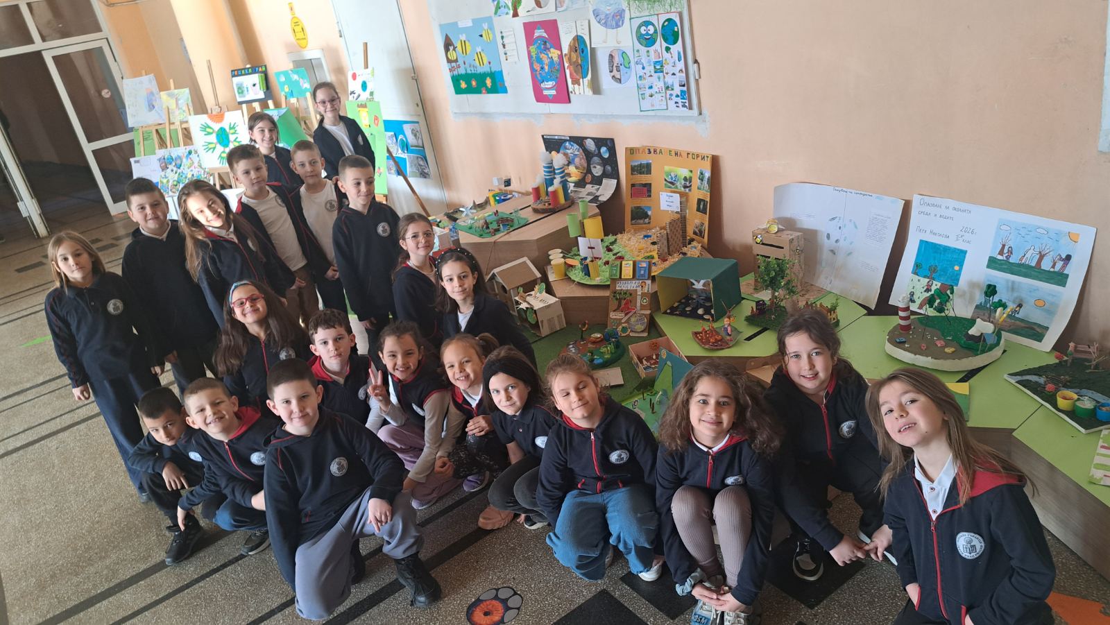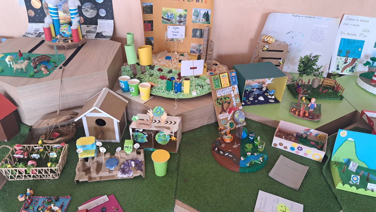 Малките ученици създадоха макети и табла, свързани с рециклирането, разделното събиране на отпадъци и грижата за растенията и животните. Всеки проект носеше личен почерк и послание – че бъдещето на Земята зависи от нашите действия днес.