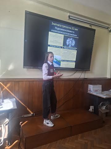 Тя впечатли журито със своя задълбочен и креативен проект на тема „Редкоземни елементи в електрическите автомобили“. В своята разработка тя представи по достъпен и научно издържан начин значението на тези елементи в съвременните технологии, тяхното приложение в електрическите автомобили и ролята им в ежедневието. Чрез ясна структура, визуално привлекателен постер и уверено представяне, тя успя да защити своята идея и да привлече вниманието на комисията.