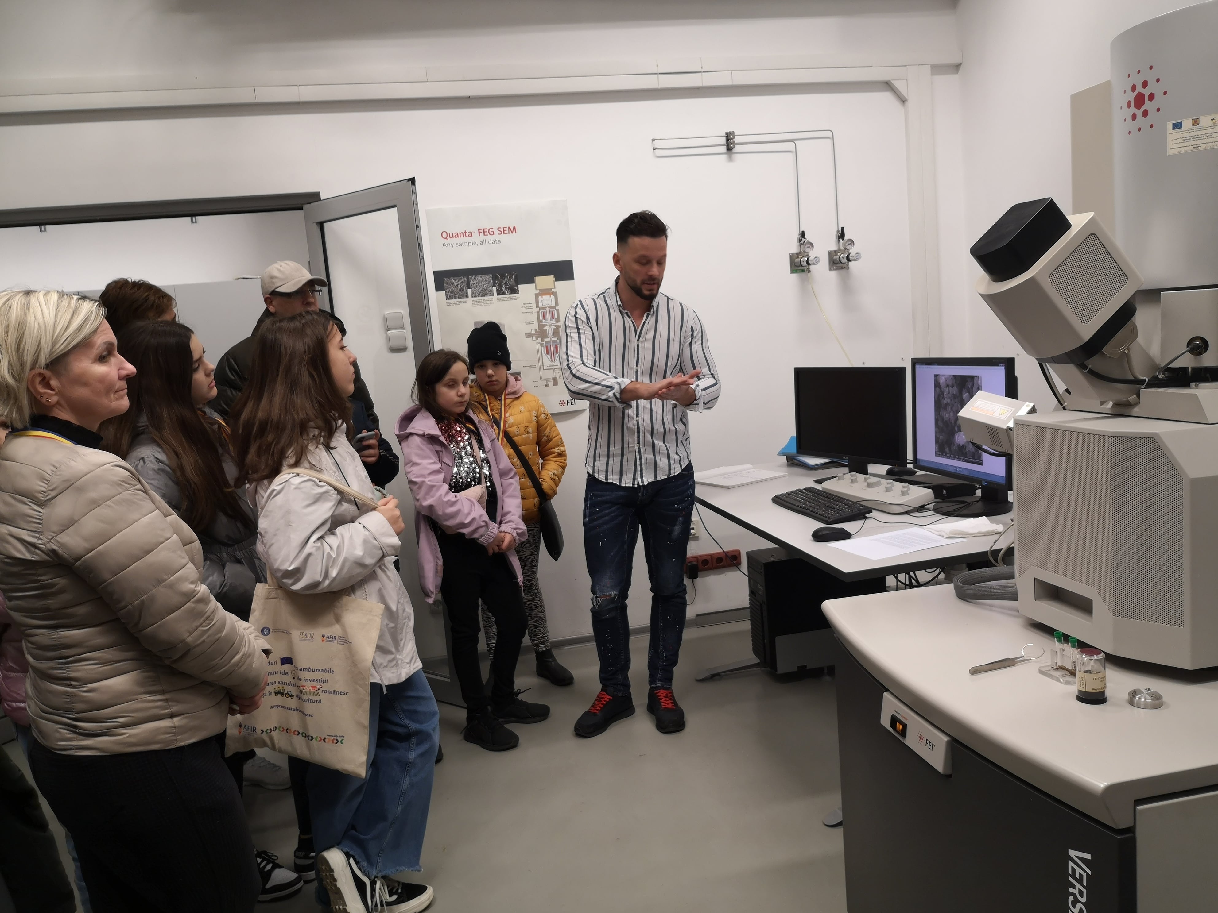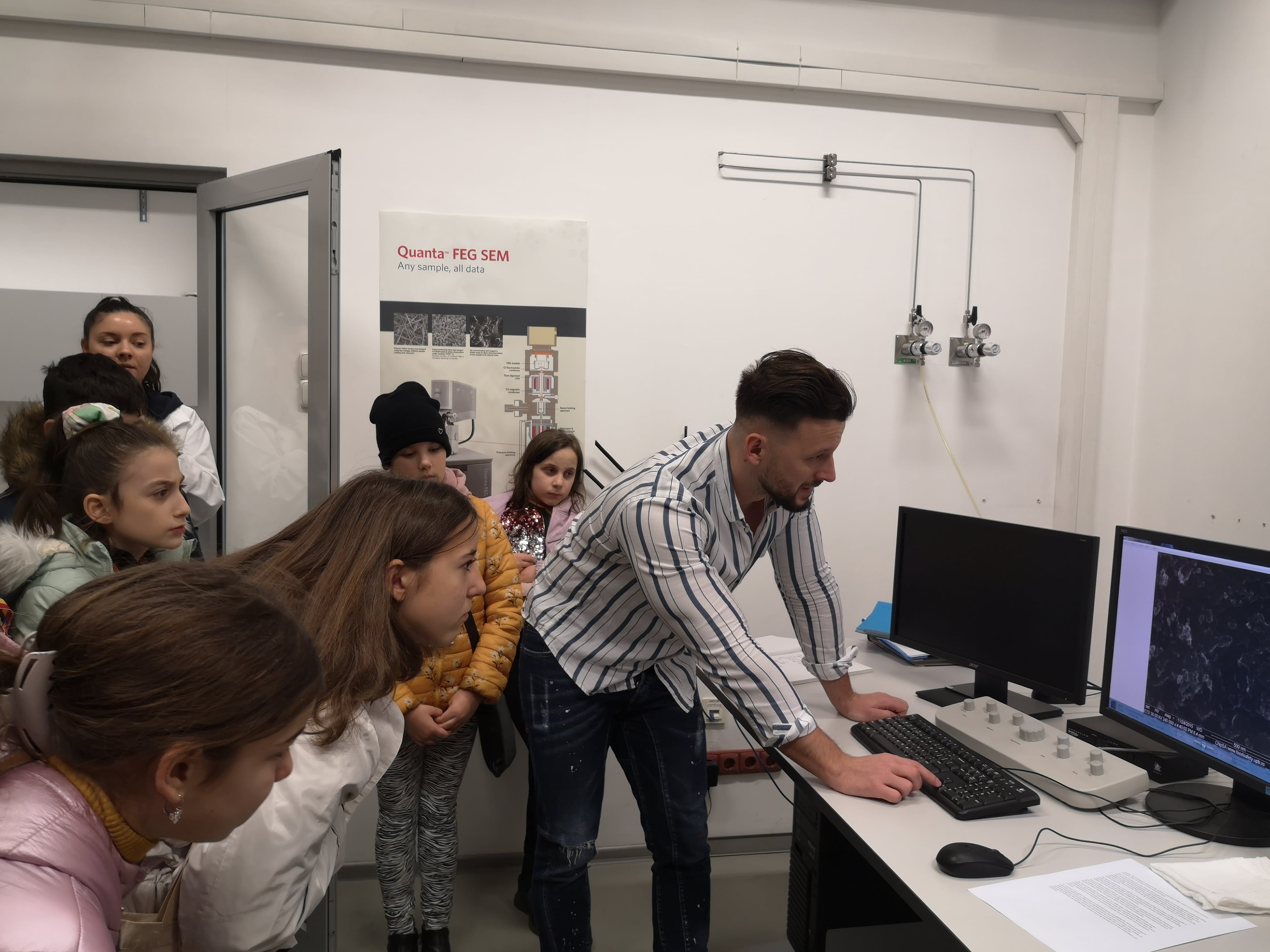 показвайки най – големия микроскоп и фрагменти от ежеднивните им научни занимания.