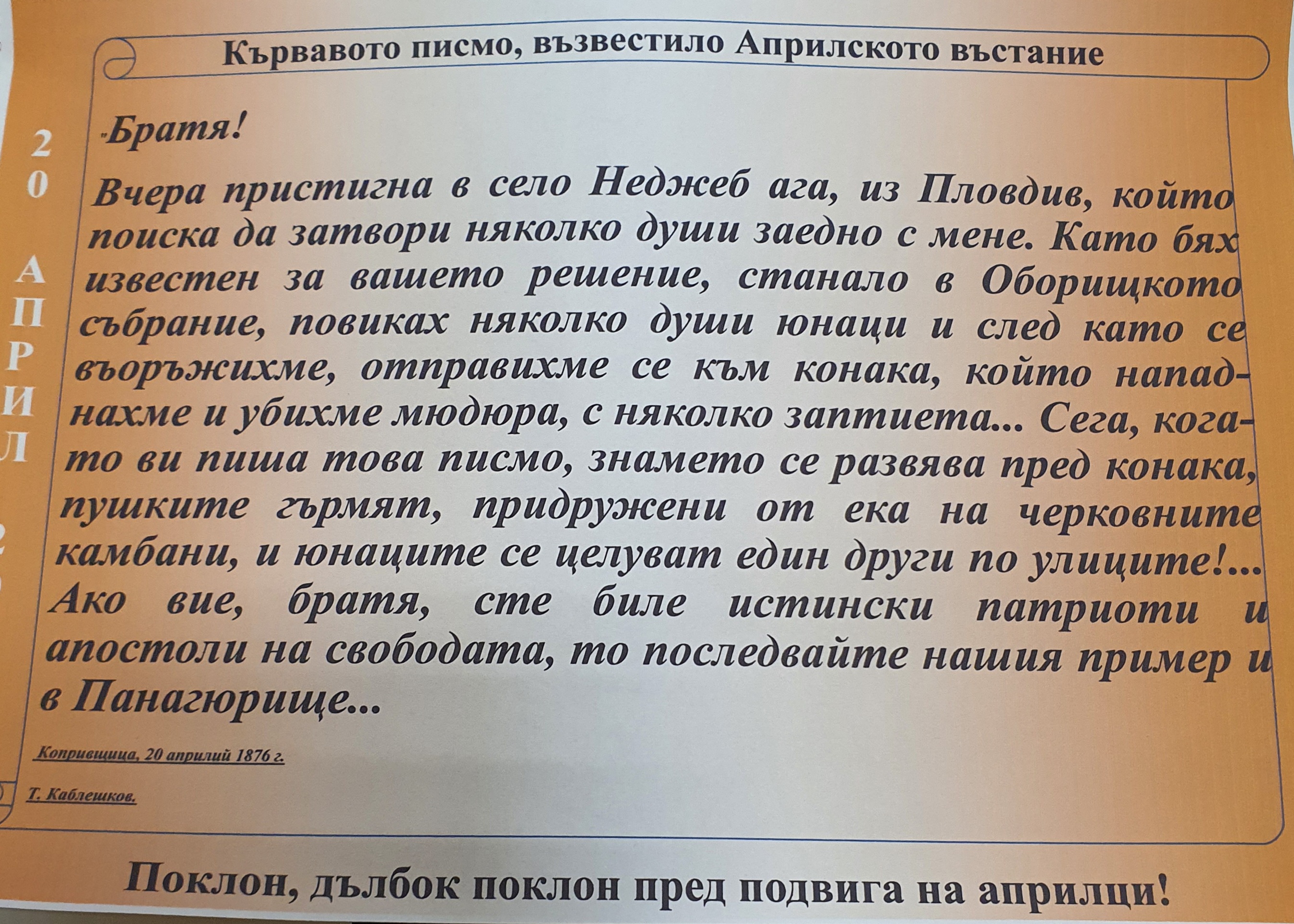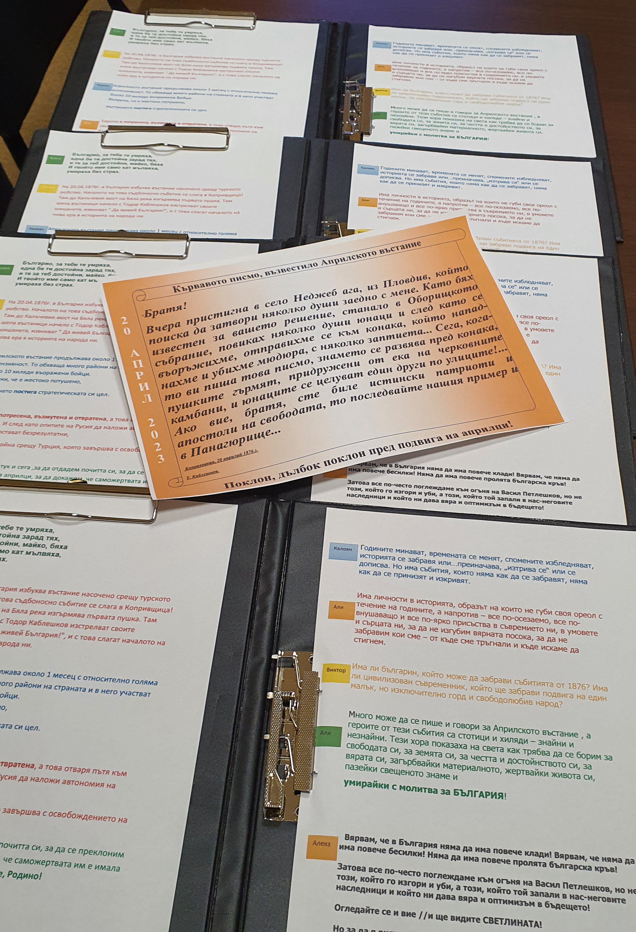 Всеки клас се преклони пред жертвения олтар на смелите ни предци, които не скланяха глава пред османския поробител. С висок патриотичен заряд звучаха думи за възхвала и преклонение. Всяка паралелка получи копие от кървавото писмо на Тодор Каблешков.