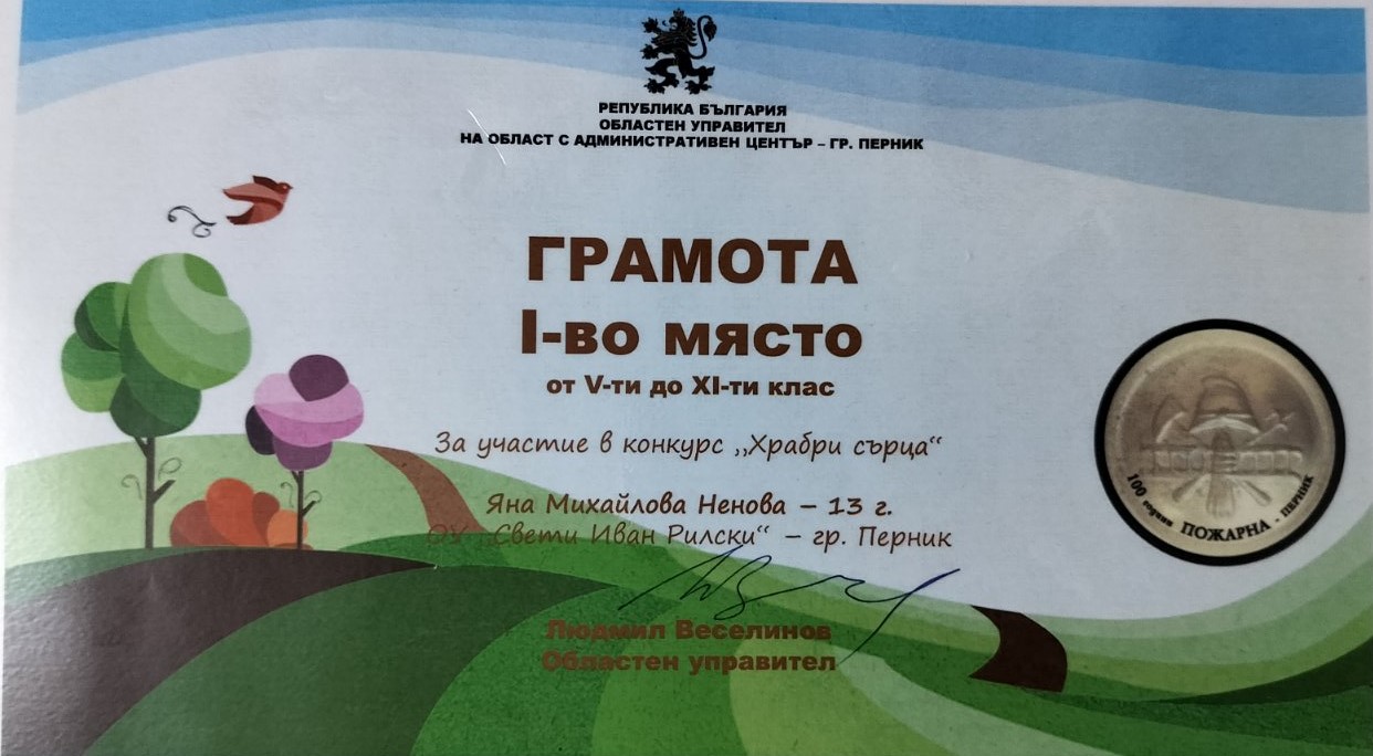 С гордост споделяме, че седем ученици от ОУ „Св. Иван Рилски“ бяха наградени в конкурса за детска рисунка „Храбри сърца“, организиран от Регионален исторически музей – гр. Перник по повод 100 години Пожарна команда – Перник.