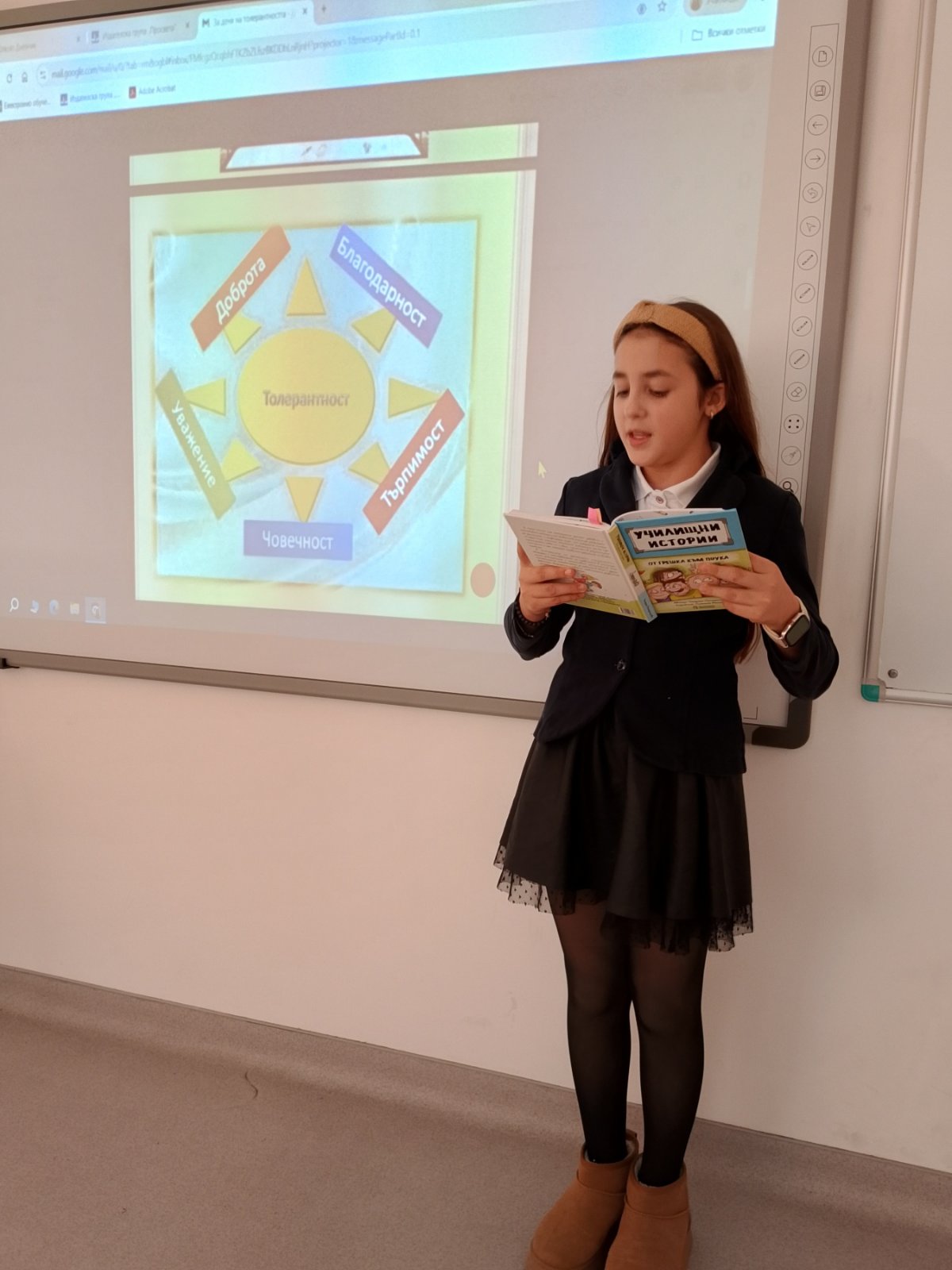 Тази учебна година, по инициатива на ученическия съвет, Денят на толерантността прерасна в Седмица на толерантността. Седмица, в която учениците от Ученическия съвет посетиха учениците от първи, втори и трети клас. Чрез приказки, игри и споделяне помогнаха на своите по-малки съученици да разберат какво е толерантност, колко е важно да приемаме различията и да се поставяме на мястото на другия.