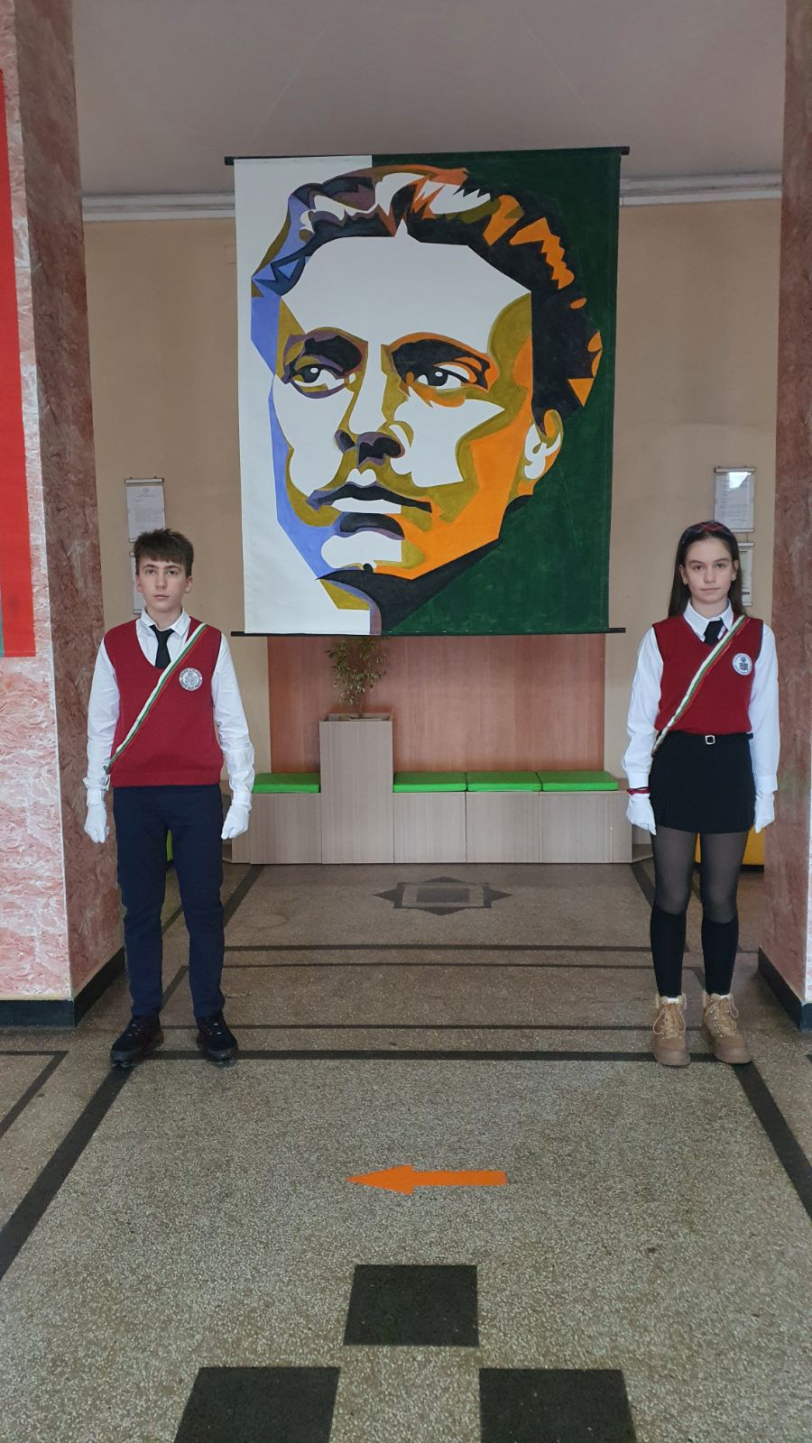 Шестокласниците застанаха на почетен пост пред лика на Апостола, отдавайки тиха и достойна почит.