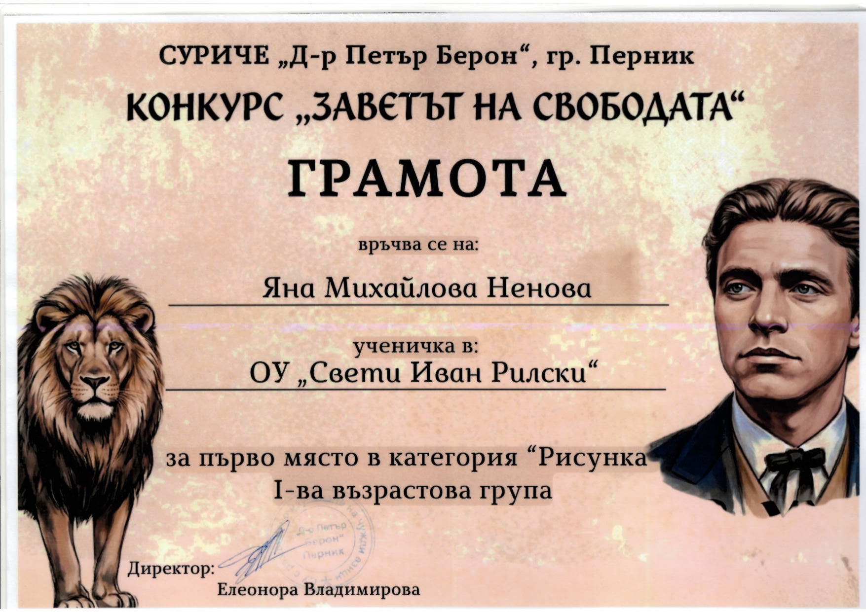 С гордост споделяме, че Яна Михайлова Ненова, ученичка от ОУ „Свети Иван Рилски“, спечели Първо място в категория „Рисунка“, I-ва възрастова група в конкурса „Заветът на свободата“, организиран от СУРИЧЕ „Д-р Петър Берон“, гр. Перник.