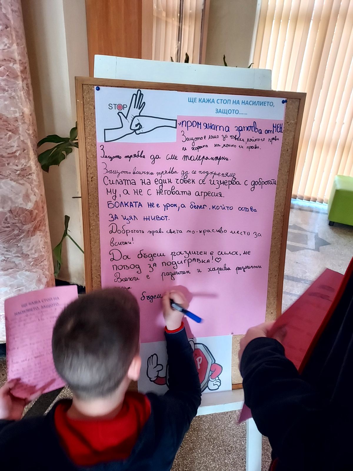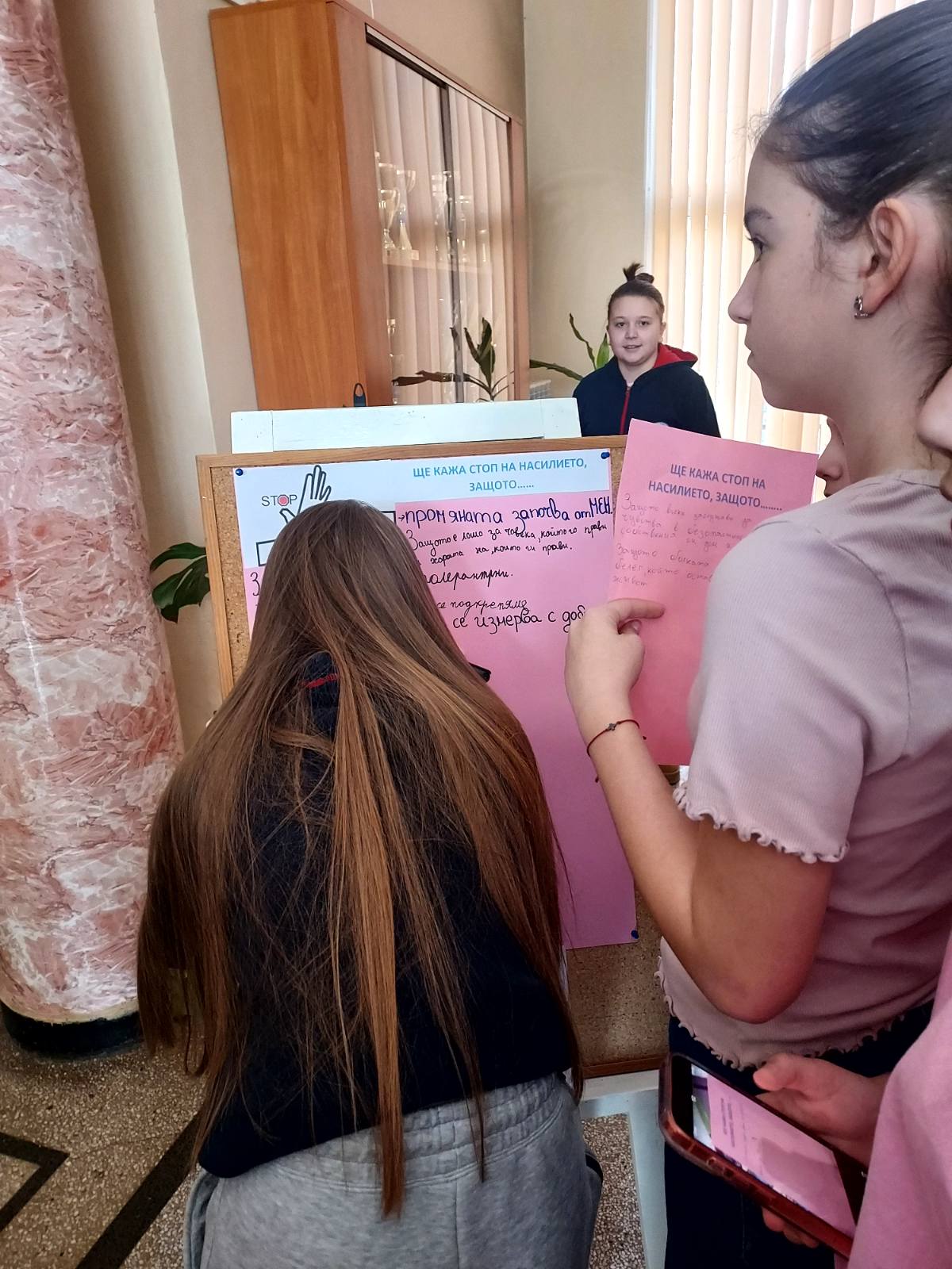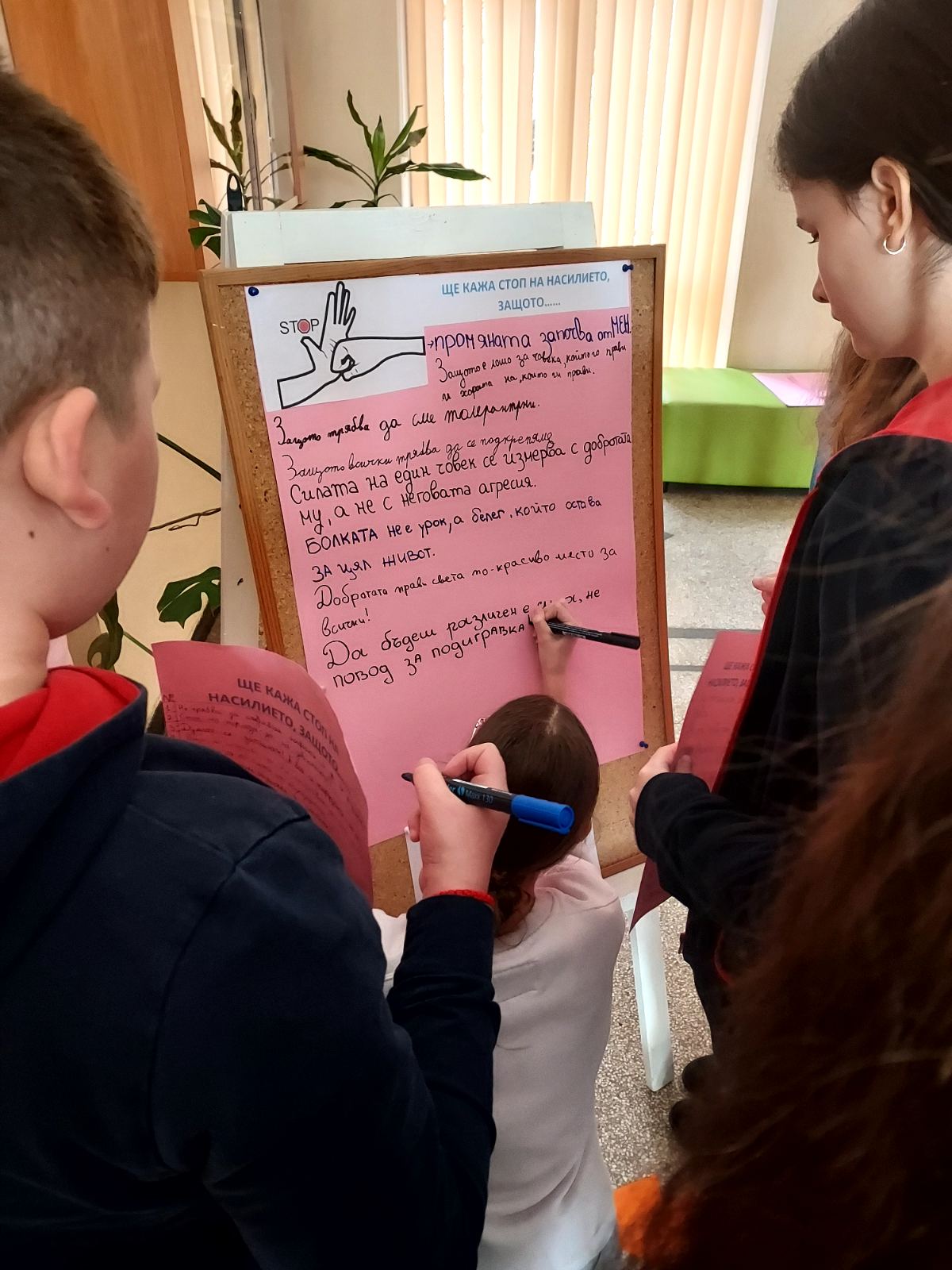 Кулминация на инициативата бе включването на представители от всеки клас, които довършиха изречението: „ЩЕ КАЖА СТОП НА НАСИЛИЕТО, ЗАЩОТО…“. Техните отговори изпълниха училищното пространство с надежда, смелост и отговорност.
