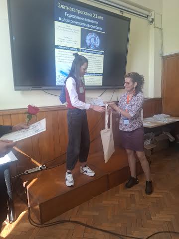 Тя впечатли журито със своя задълбочен и креативен проект на тема „Редкоземни елементи в електрическите автомобили“. В своята разработка тя представи по достъпен и научно издържан начин значението на тези елементи в съвременните технологии, тяхното приложение в електрическите автомобили и ролята им в ежедневието. Чрез ясна структура, визуално привлекателен постер и уверено представяне, тя успя да защити своята идея и да привлече вниманието на комисията.